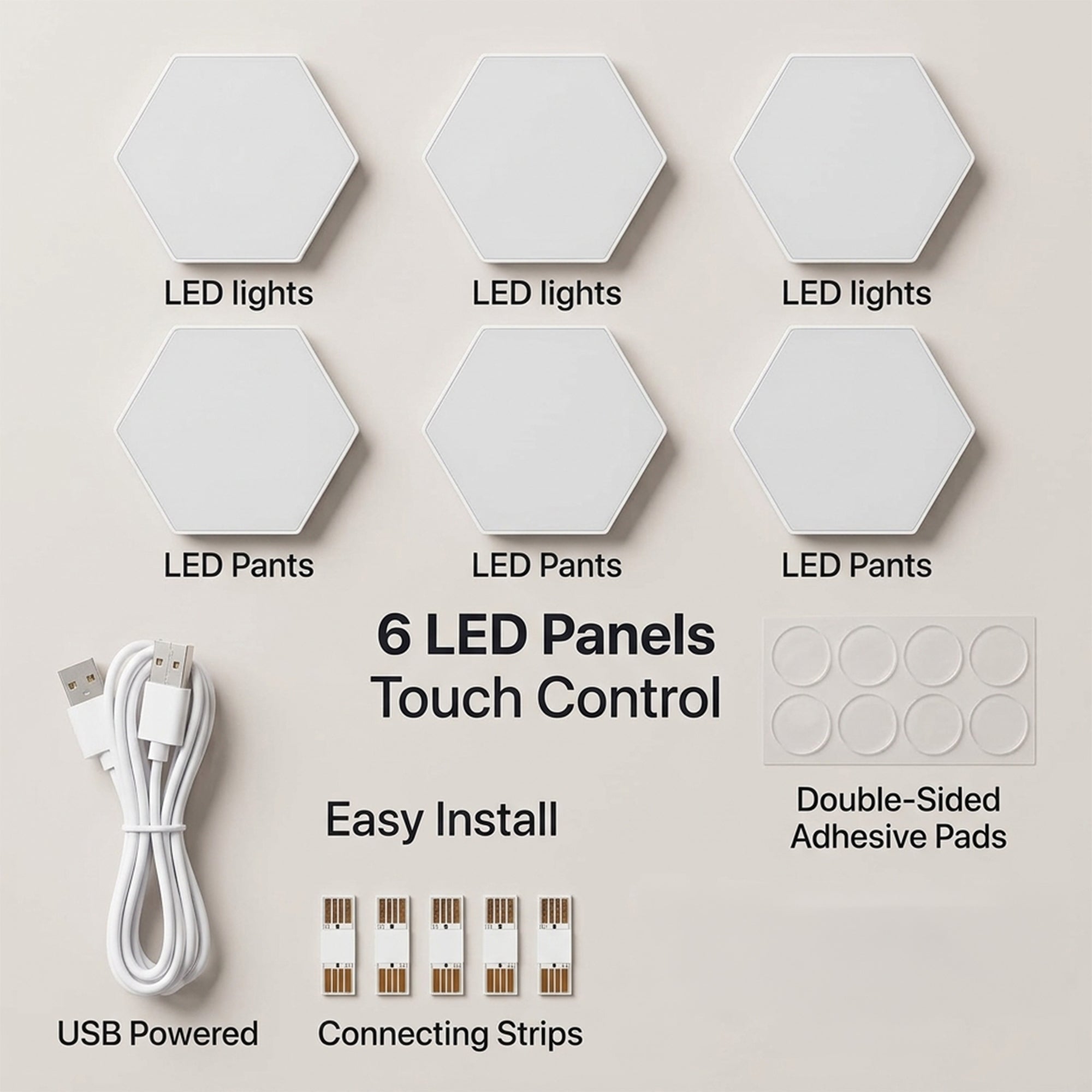 Each lightweight panel is an independent, touch-activated light. Simply tap the panel to turn the warm LED light on or off. Connect the 6 tiles together on your wall using the included adhesive backing to create any shape you like. Charge each panel as needed with the included USB cables.