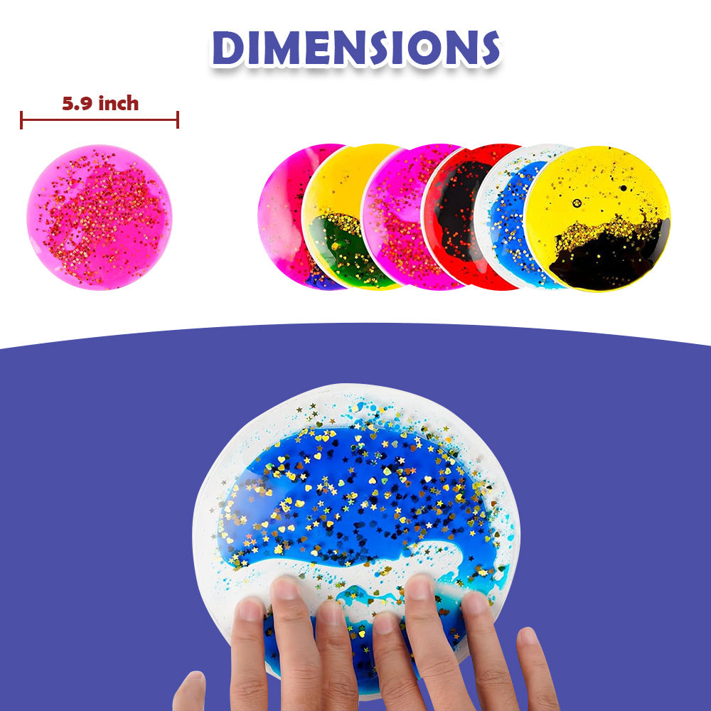 The 6-pack set lets you switch colors. Every disc is filled with liquid and bright glitter. These liquid fidget sensory toys are strong. The material resists daily squeezing. They work for classrooms and therapy sessions. Use them during breaks or quiet time. Many people find the swirling effect relaxing. The toys are safe and non-toxic.