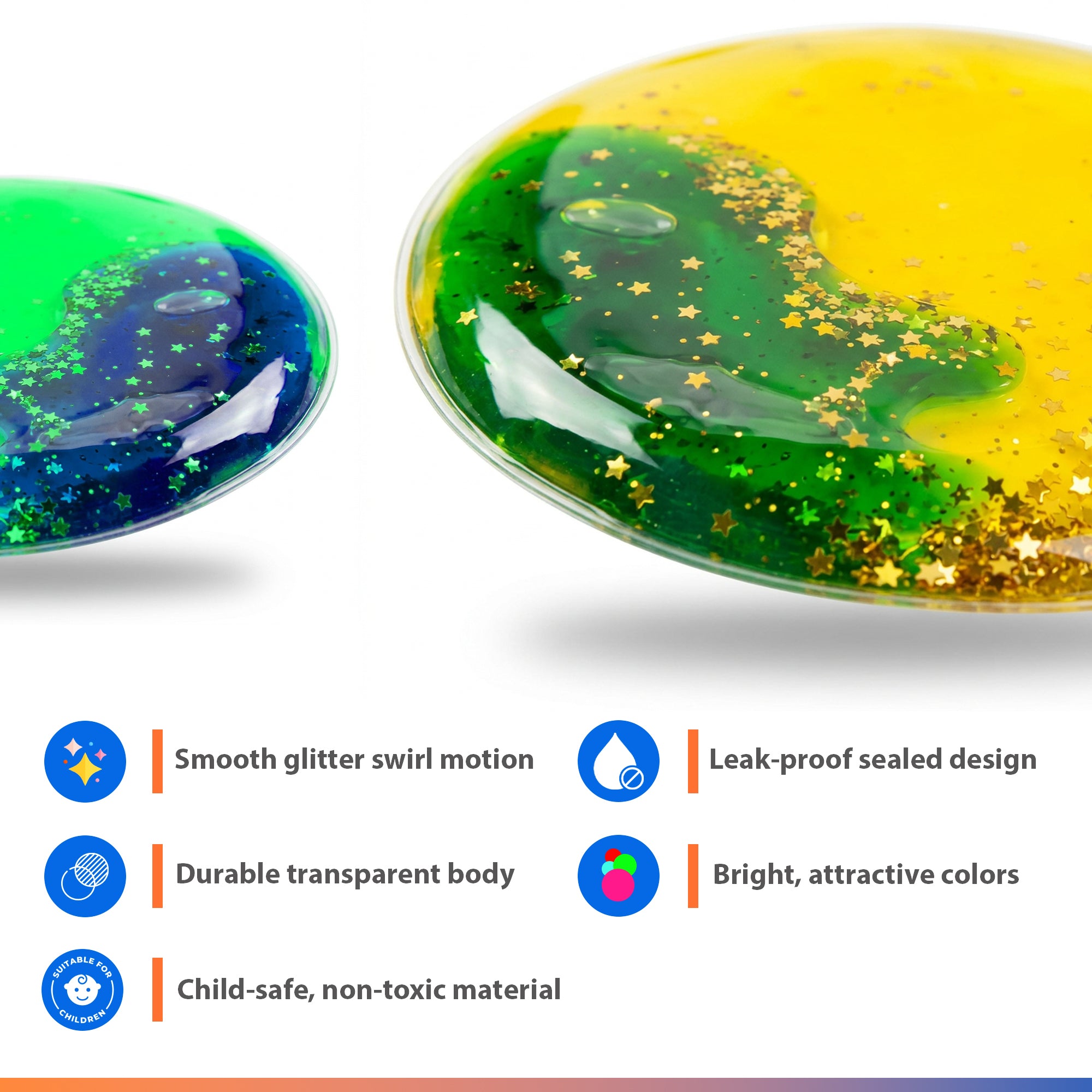 The 6-pack set lets you switch colors. Every disc is filled with liquid and bright glitter. These liquid fidget sensory toys are strong. The material resists daily squeezing. They work for classrooms and therapy sessions. Use them during breaks or quiet time. Many people find the swirling effect relaxing. The toys are safe and non-toxic.